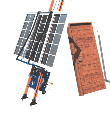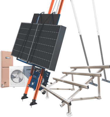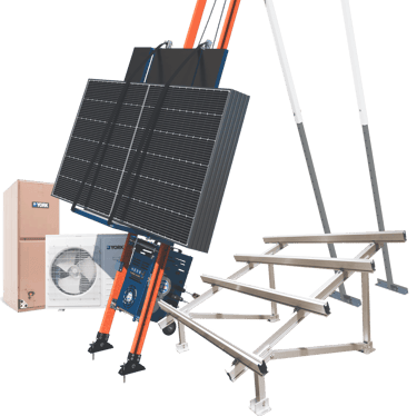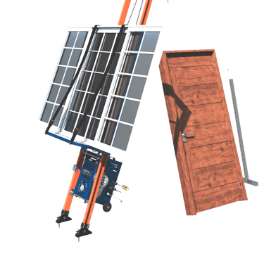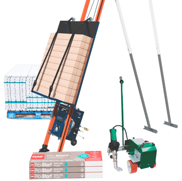 Our patented logistics system with a lift capacity of 260kg/570lbs and travel speed of 20m/65ft per minute, requires no tolls, is quick to assemble and will fit in your truck, or van or standard trailer - synchronizes labor with real‑time ground‑to‑roof material demand creating job sites that are smarter, safer, and consistently more profitable.